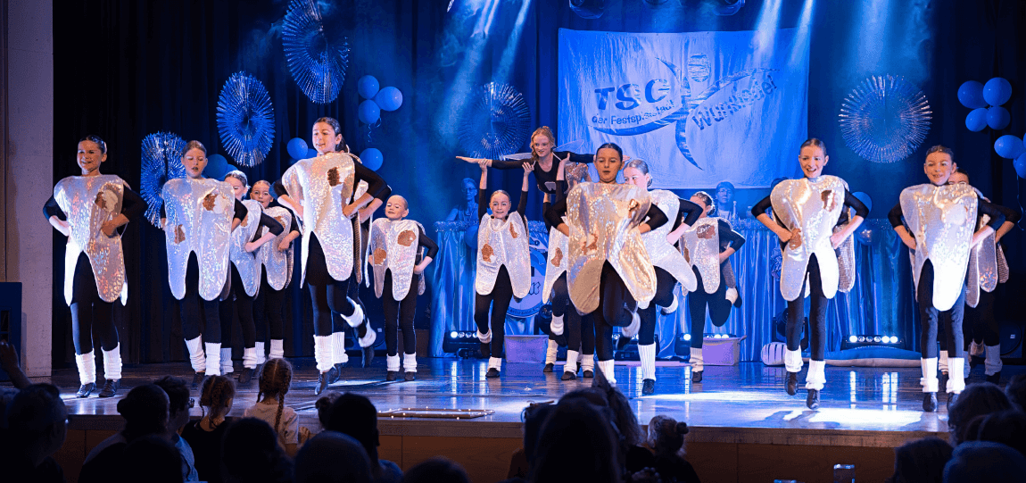 Im Mittelpunkt der Schautänze steht eine Geschichte, die durch den Tanz erzählt wird. Unsere Jugendgruppe wählte die Geschichte der Zahnfee, die nur makellos gepflegte Zähne aufnimmt, für einen ihren Schautänze. Die Zähne bereiten sich mit großer Freude und viel Engagement darauf vor, von der Zahnfee abgeholt zu werden. Durch ausdrucksstarke Choreografie und farbenfrohe Kostüme vermitteln die Tänzerinnen und Tänzer spielerisch die Bedeutung von Zahnhygiene. Am Ende werden alle Zähne von der Zahnfee eingesammelt – und für die Jugendgruppe wie das Publikum ein tänzerisches Highlight voller Spaß und Aussagekraft.